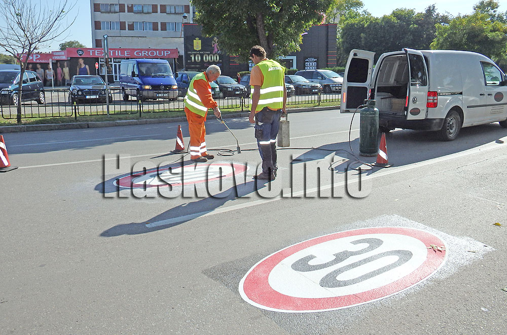 Полагат се предварително формировани термопластични знаци. Местата са с интензивен трафик и целта е да се засили вниманието на шофьорите.