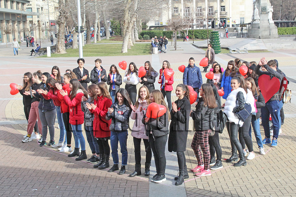 Десетки младежи се подредиха във формата на голямо сърце на площад „Свобода“ в Хасково за Деня на влюбените.