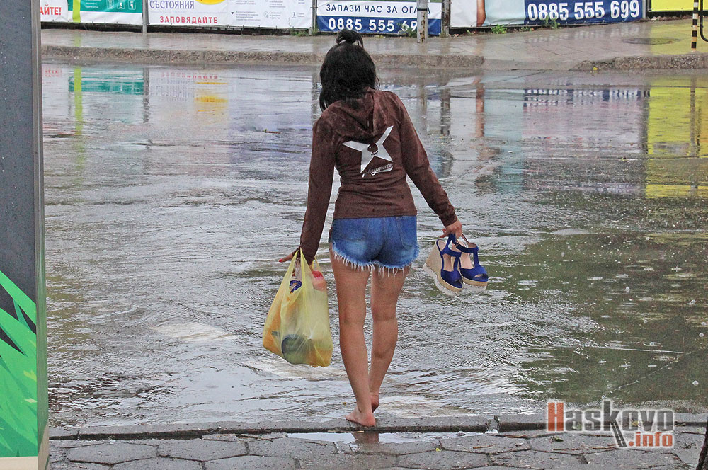 Жена преминава боса през наводнените от бурята булеварди в Хасково.