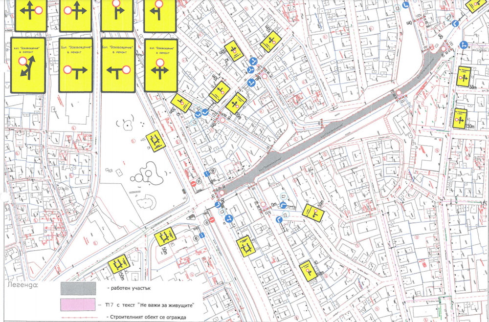 Причината е реконструкция на вътрешна водопроводна мрежа. Разрешението за началото на строителните работи е от 8 октомври. За целта се въвежда Временна организация на движението по булевард „Освобождение“. Движещите се от булевард „Илинден“ към булевард „България“ се пренасочват по бул. „Илинден“ – бул. „Васил Левски“ – бул. „България“ – кръстовище с бул. „Освобождение“. Движещите се от бул. „България“ към бул. „Илинден“ се пренасочват по бул. „България“ – бул. „Васил Левски“ – бул. „Илинден“ – кръстовище с бул. „Освобождение“. Промените се сигнализират с пътни знаци Ж3 с надпис „бул. „Освобождение“ в ремонт“ и схема на обходния маршрут. Допълнително се поставят табели Т17 с надпис „Не важи за живущите“, като при пропускане на МПС на живущите, движението ще се регулира с регулировчик и ще се преустановява работата на машините. Временната сигнализация се поставя за период до 12 декември 2020 г.