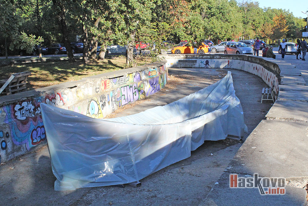 Дървената лодка в сухото езеро на Кенана в Хасково е увита в найлони за зимата.