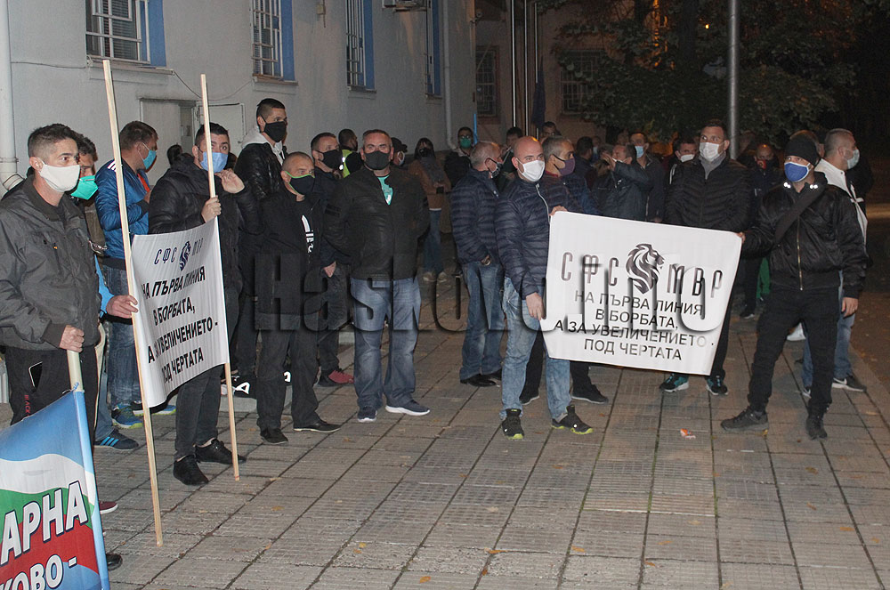 Служители от структурите на МВР протестираха тази вечер пред сградата на полицията в Хасково. В недоволството се включиха пожарникари и полицаи от цялата област и от Кърджали.