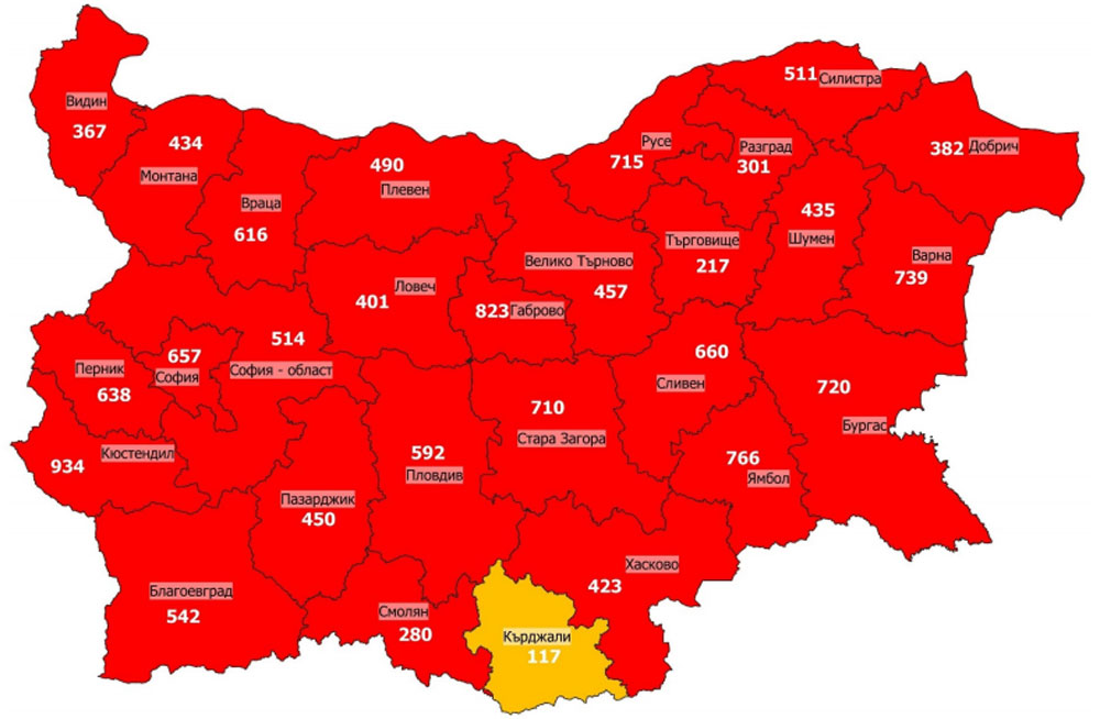 След наложените от 27 ноември по-строги противоепидемични мерки заболяемостта в страната спада, като например вече няма области с над 1 000 заразени на 100 000 души. Кърджали остава единствената област в оранжевата зона със 117 инфектирани на 100 000 души.