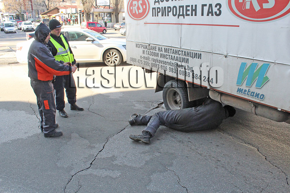 Товарен автомобил за доставка на природен газ аварира по обяд на кръстовището до зеленчуковия пазар в Хасково.