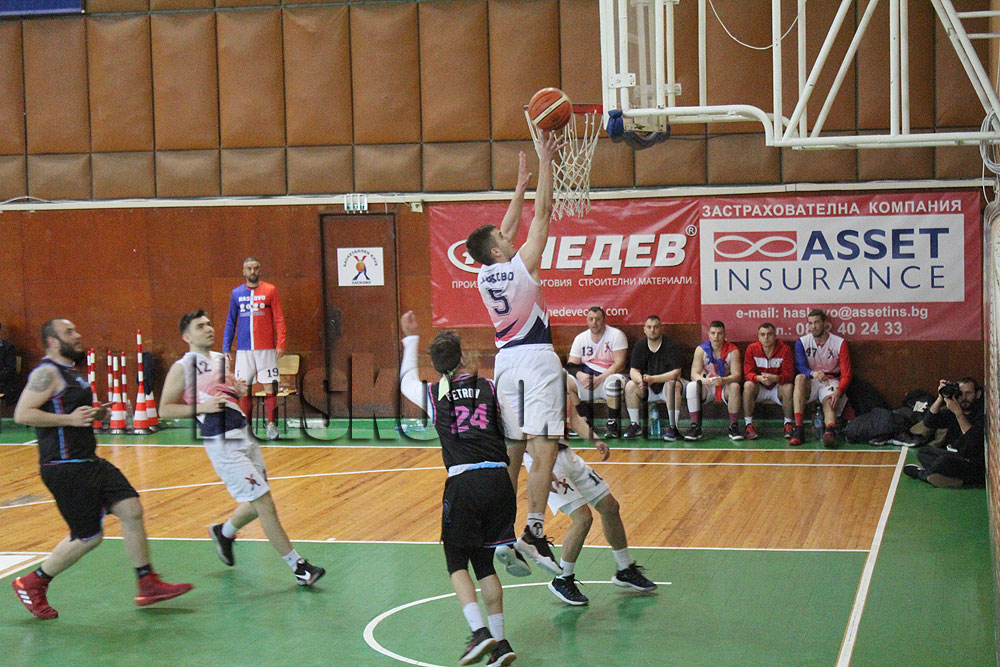 Срещата се игра в хасковската спортна зала „Дружба“. Домакините имаха надмощие през целия мач. 35 точки реализира Ивайло Тонев, капитанът Динко Христов и Виктор Колянов завършиха с по 18 т., а Евгени Вълчев добави 11 т.