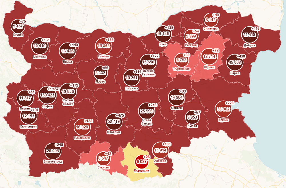 Новозаразените за последните 14 дни в региона са 504.9 на 100 000 души. Засега само Кърджали е във втората зона, а в третата са Смолян, Търговище и Шумен. Всички останали области са в четвърта зона.