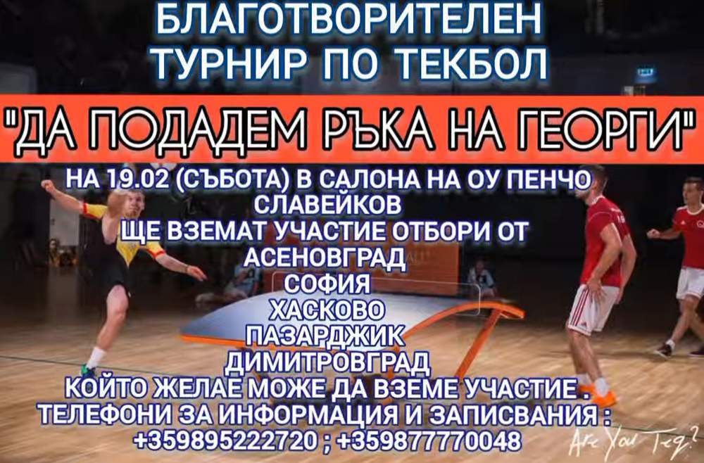 Благотворителен турнир по текбол „Да подадем ръка на Георги“ ще се проведе на 19 февруари от 10 часа във физкултурния салон на ОУ „Пенчо Славейков“ в Димитровград, съобщават организаторите.