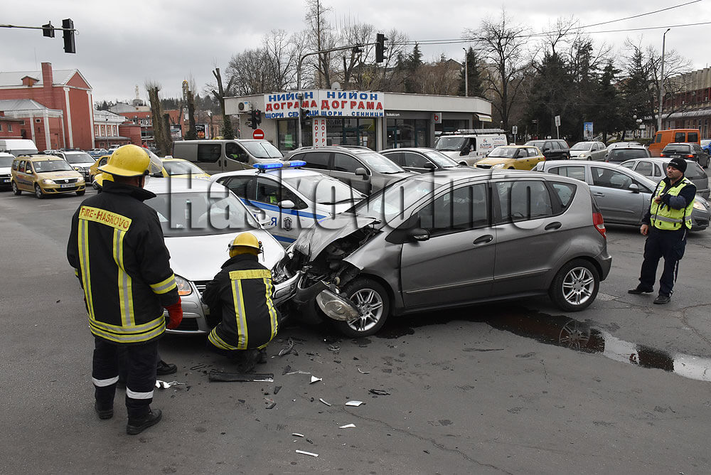 Два леки автомобила от марките Мерцедес и Фолксваген катастрофираха следобед на кръстовището до зеленчуковия пазар в Хасково.