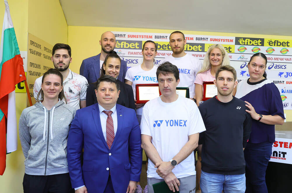 Председателят на Българска федерация бадминтон Володя Златев връчи специално изработени плакети на звездите на бадминтона Габриела и Стефани Стоеви, които спечелиха на двойки жени трета титла на Европейското първенството.