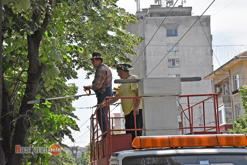 Работници с вишка режат клоните, които са до жиците на тролеите по булевард „Раковски“ в Хасково.