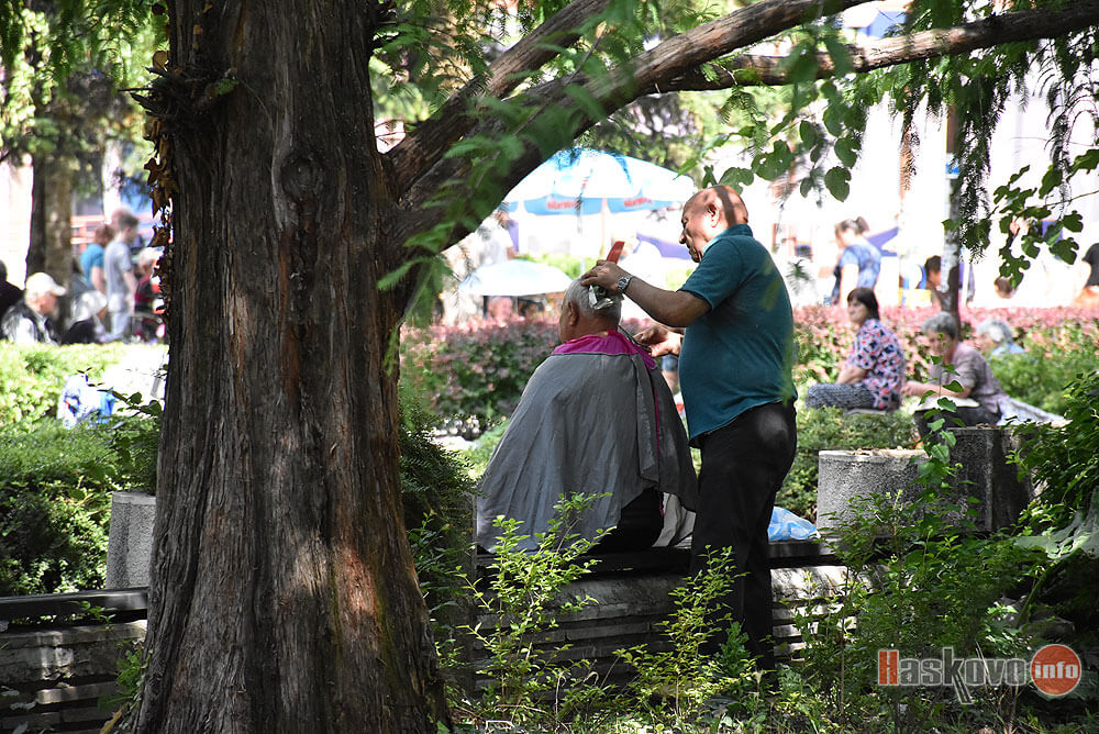 Хасковлии се подстригват на открито в паркчето пред Бизнесцентъра.
