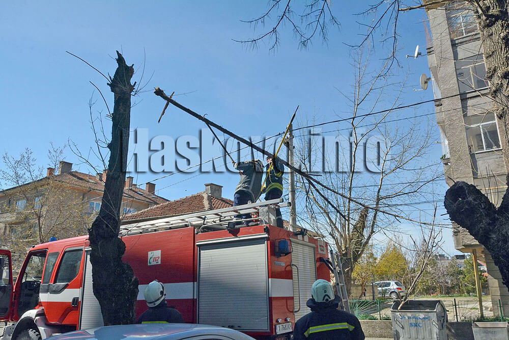 По пешеходната зона на центъра имаше паднали клони. В пожарната пък се получи сигнал за опасно надвиснал клон над паркирани коли на улица „Георги Кирков“ до сградата на НОИ. Пожарникарите отстраниха клона и обезопасиха мястото.