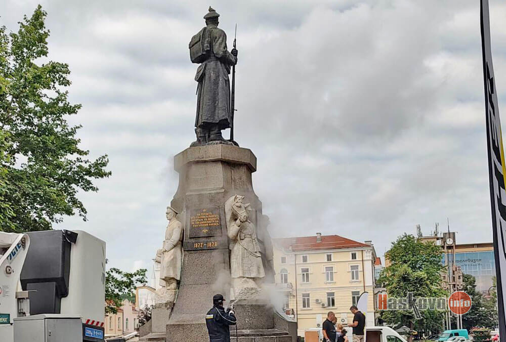 Със специализирана техника беше почистен паметникът на Незнайния воин в центъра на Хасково.
