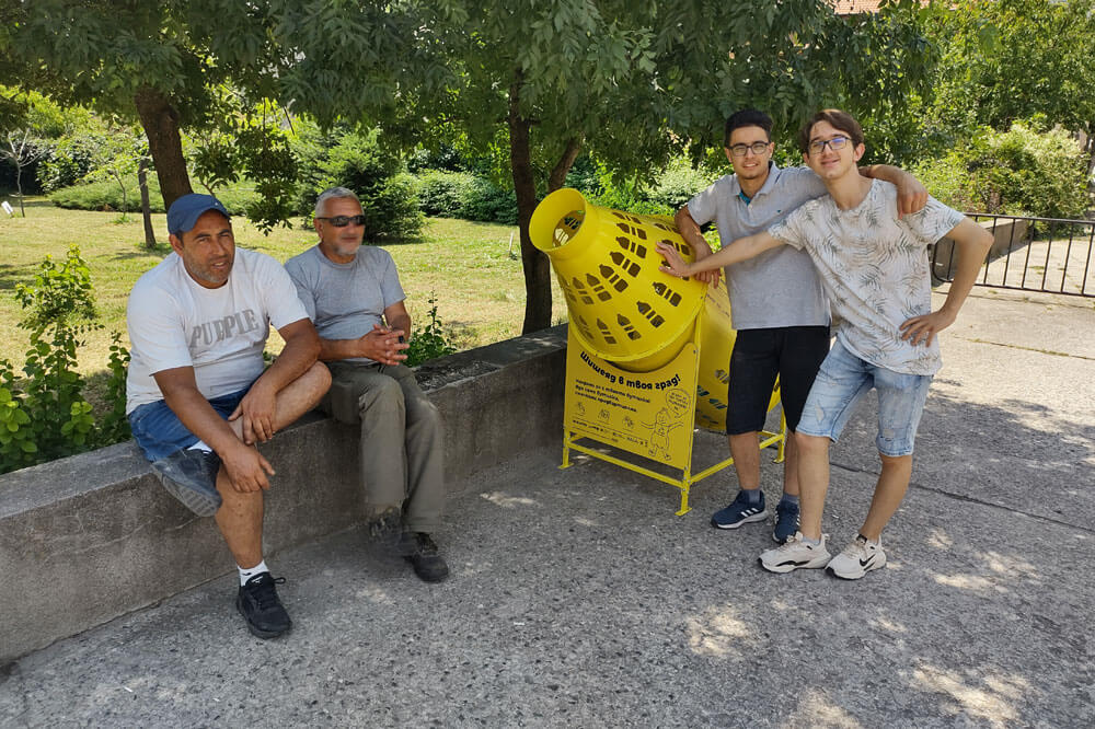 Арт инсталацията „Шишеяд“ насърчава посетителите на парка до Езиковата гимназия в Хасково да събират разделното пластмасови бутилки.