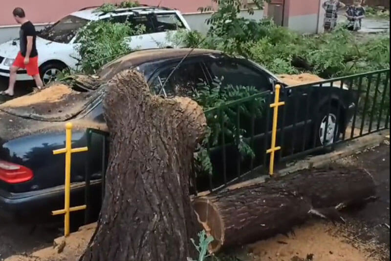 В центъра голямо дърво е смачкало 4 автомобила. Няма данни за пострадали хора. Половин час след бурята към пожарната бяха подадени 12 сигнала.