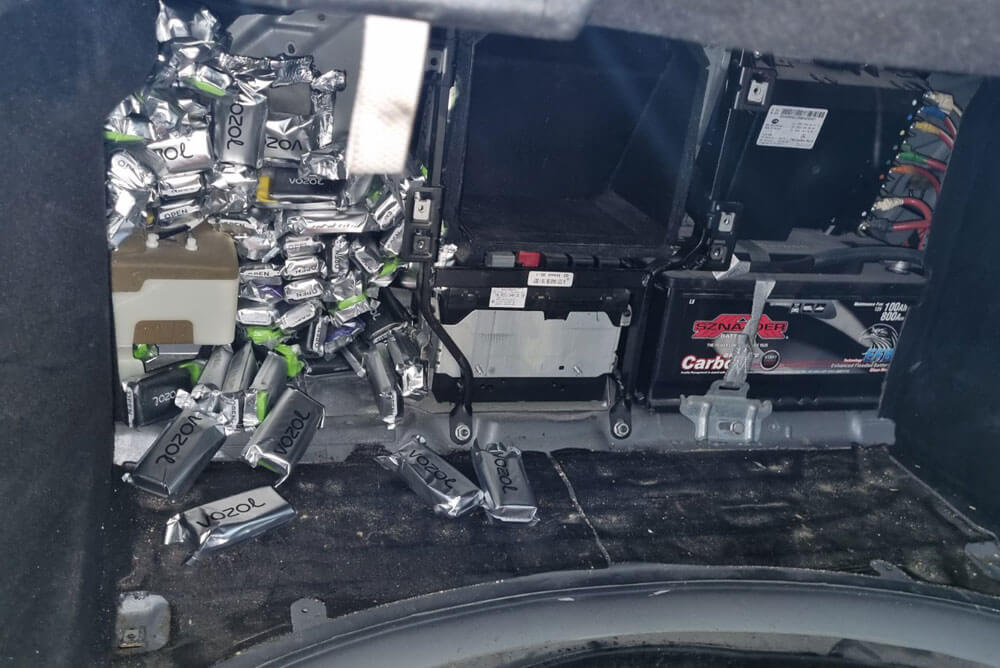 След отстраняване на корите за резервната гума и предната стена на багажника, във фабрични кухини, са открити 195 електронни наргилета за еднократна употреба, без акцизен бандерол.