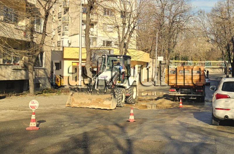 Екип на ВиК работи по ремонта на спуканата тръба, като тежка техника е разкопала улицата.