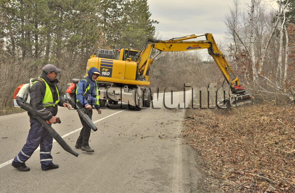 Причината е, че тежка техника и работница почистват храсти и друга растителност в пътния участък.