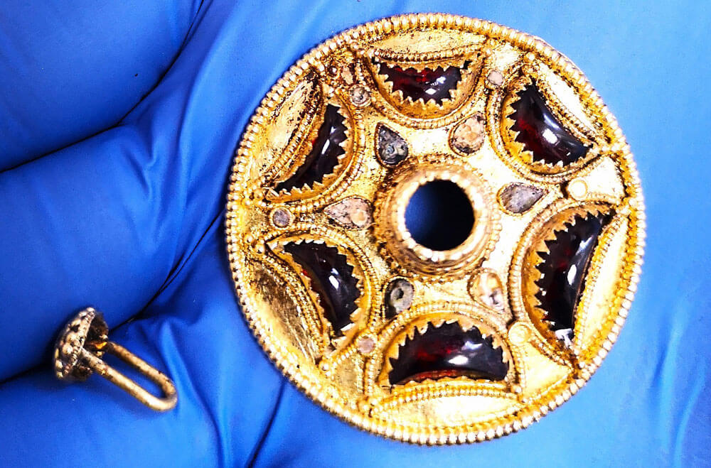 Още два предмета от този обект ще бъдат показани по време на изложбата – златна фибула и украсена с гранати и емайл апликация, заедно с елемента за прикрепване към ризницата или друга част от снаряжението на знатния воин.