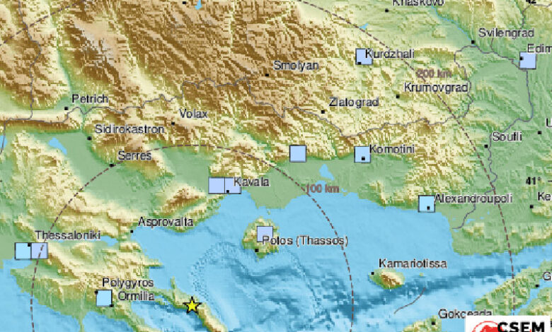 Трусът е в Егейско море и е регистриран в 18:11 часа. Земетресението е с дълбочина 5 километра и е на 109 километра източно от Солун, съобщават от европейския сеизмологичен център.
