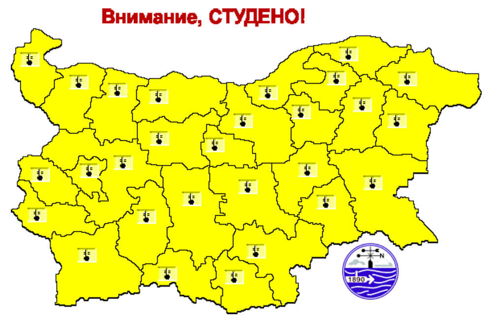 Жълт код за ниски температури е обявен за четвъртък в цялата страна от Националния институт по метеорология и хидрология.