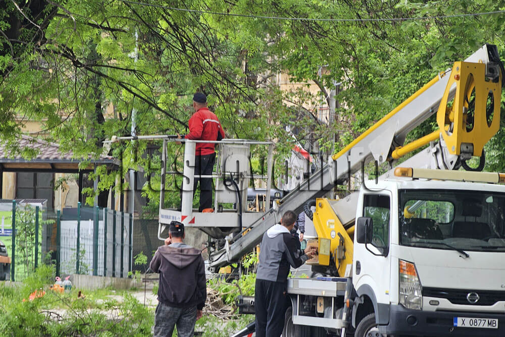 Работници с помощта на вишка премахнаха дървета на улиците „Средна гора“ и „Георги Кирков“. Движението там беше временно ограничено.