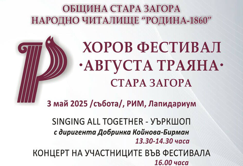 Детският хор „Орфей“ с диригент Елена Цветкова и женският народен хор „Зора-Зорница“ при читалище „Зора“ с диригент Иванка Топузова участват в днешния Национален хоров фестивал „Августа Траяна“ в Община Стара Загора.