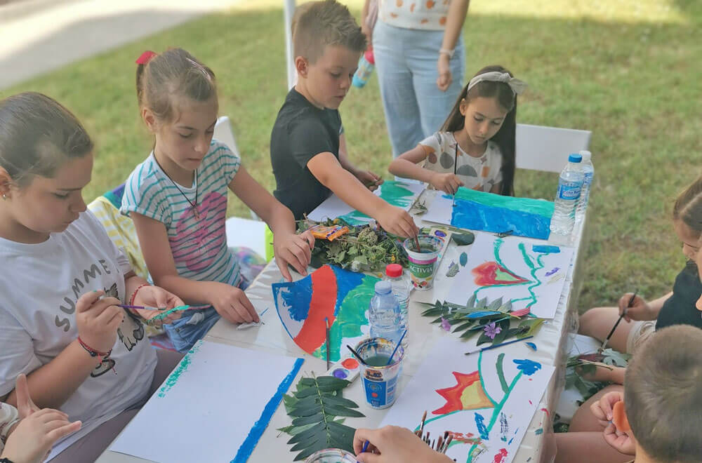 Малките художници рисуваха пейзажи с темперни бои, изпробваха отпечатване на листа, треви и други природни материали, с които създадоха оригинални картини. Детските творби ще бъдат показани на изложба в края на юли.