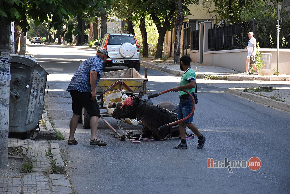 Впрегнат в каруца кон се подхлъзна и падна на улица „Георги Кирков“ в Хасково. Животното беше изправено с помощта на собствениците му.