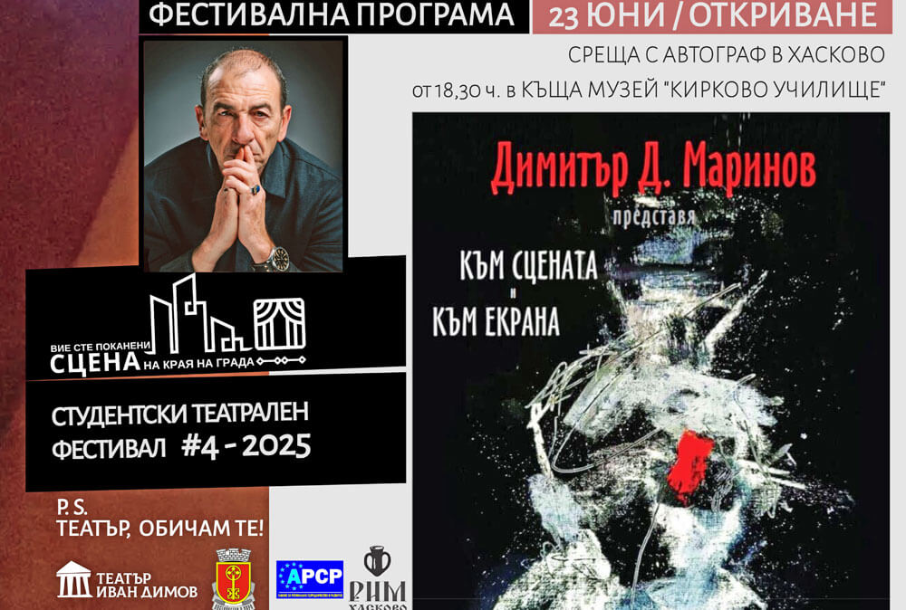 | 23 юни 18,30 ч. | Представяне на книгите „Към сцената“ и „Към екрана“ на Димитър Маринов и творческа среща с автора Къща музей „Кирково училище“, Хасково ул. „Цар Освободител“ 10 |