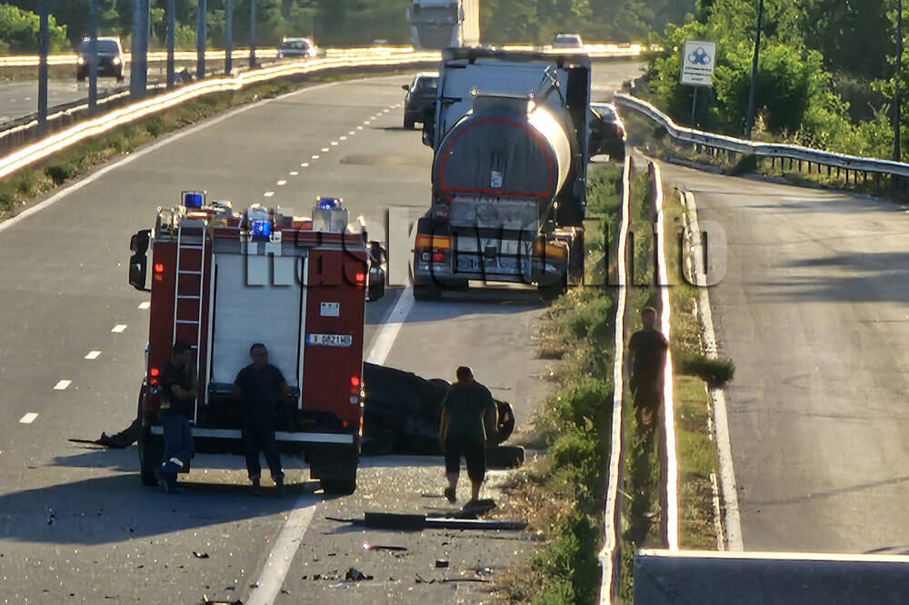 По първоначална информация леката кола е застигнала товарен автомобил – цистерна и се е ударила в него, като е последвало преобръщането й.