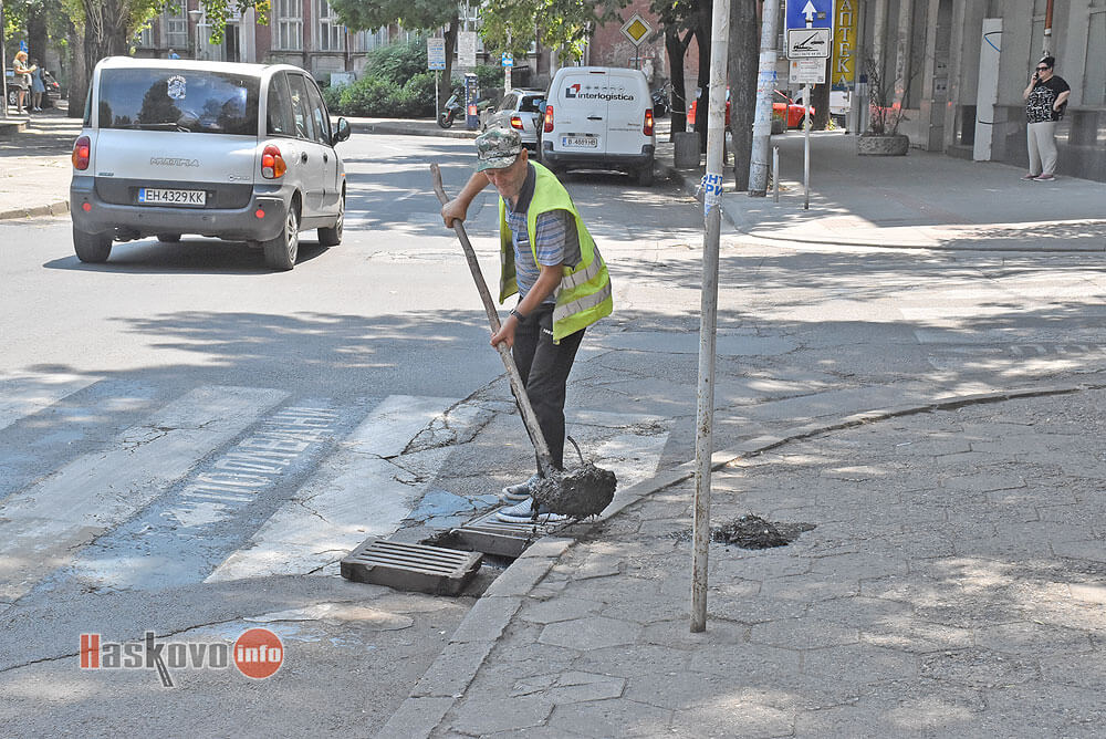 Работници на "Екопрогрес" почистват шахти по булевард "България" в центъра на Хасково.