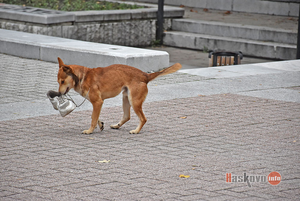 Куче си поигра следобед с маратонка пред хасковското читалище "Заря".