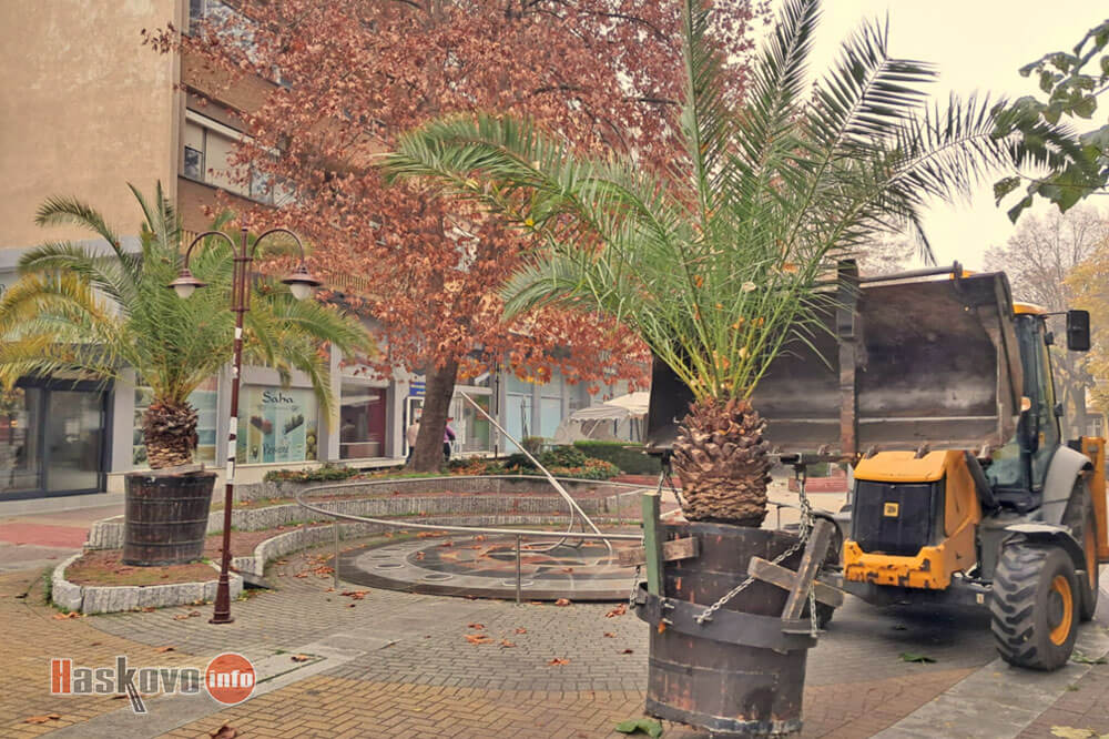 От „Екопрогрес“ прибират екзотичните растения от центъра на Хасково. Те ще зимуват в парника на общинското предприятие.