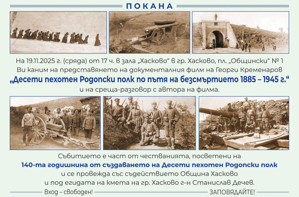 Безплатна прожекция на филм за Десети пехотен Родопски полк в Хасково