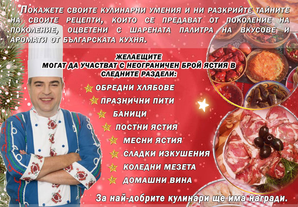 Кулинарният конкурс се провежда за тринадесета година и ще представи автентични ястия, типични за празниците по Коледа. Конкурсът има осем раздела – обредни хлябове, празнични пити, баници, постни ястия, месни ястия, сладки изкушения, коледни мезета и домашни вина, в които желаещите ще могат да представят своите кулинарни умения с неограничен брой ястия и напитки.