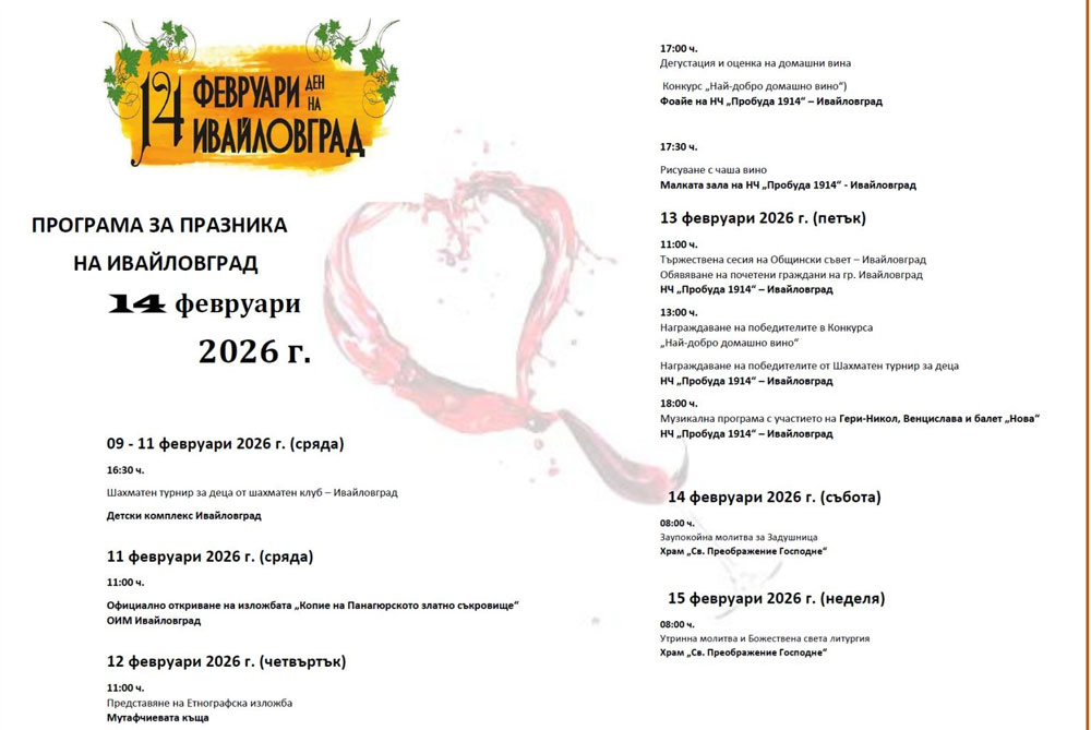 На 11 февруари е и официалното откриване на изложбата „Копие на Панагюрското златно съкровище“, с която Националният исторически музей гостува на ивайловградчани. Експозицията, очаквана с голям интерес, ще може да се разглежда в Общинския исторически музей, откриването е в 11 ч.