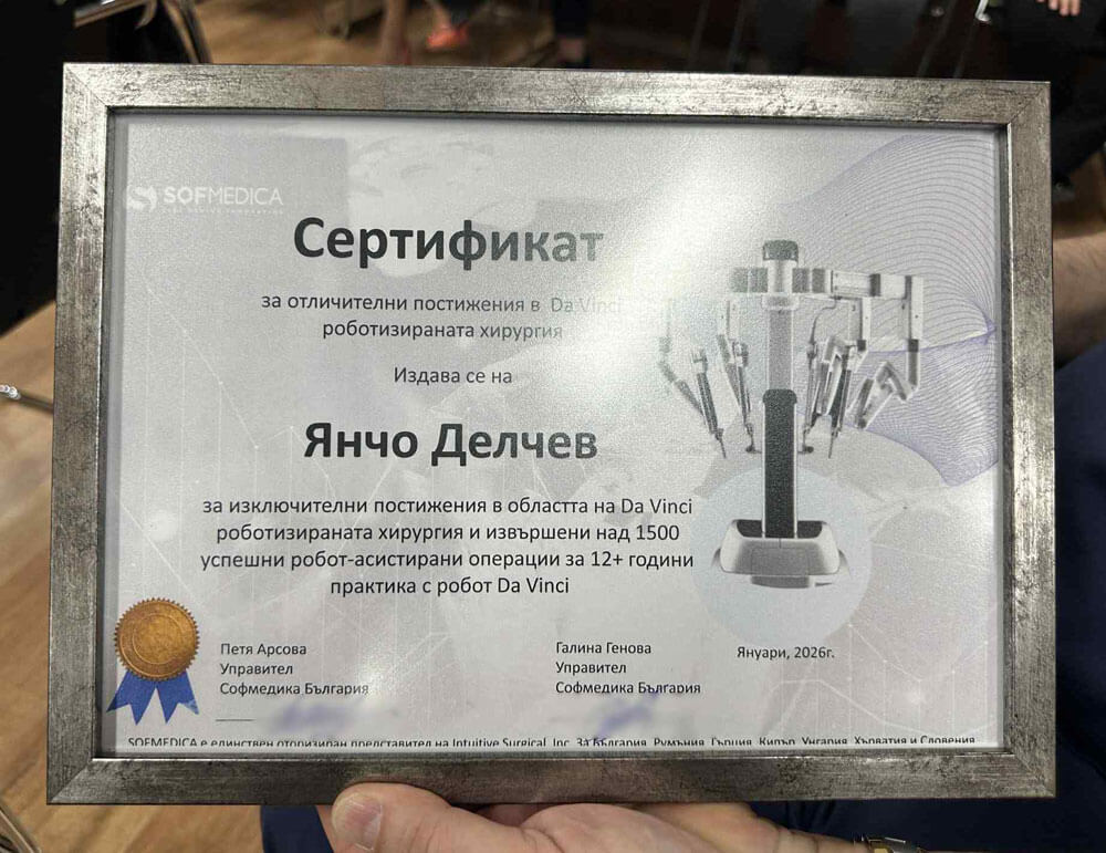 През януари тази година доц. Делчев получи сертификат за изключителни постижения в Da Vinci роботизираната хирургия и извършени над 1 500 успешни робот асистирани операции.