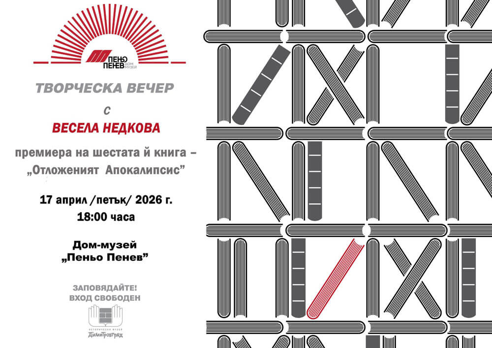 Поводът е премиерата на шестата й книга „Отложеният Апокалипсис“, която ще бъде представена от хасковската поетеса Ели Видева.