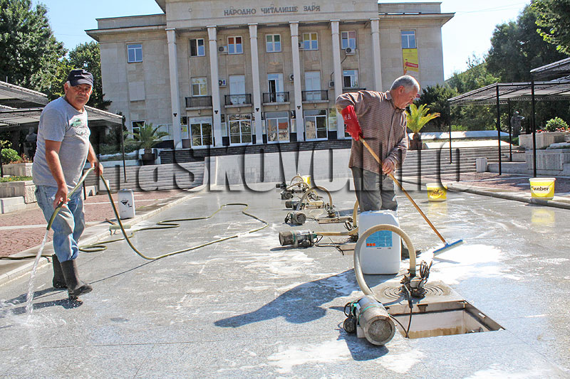 От общината почистват фонтаните пред хасковското читалище „Заря“. Всички помпи са извадени за да се измият, лъска се и площадката около фонтаните.