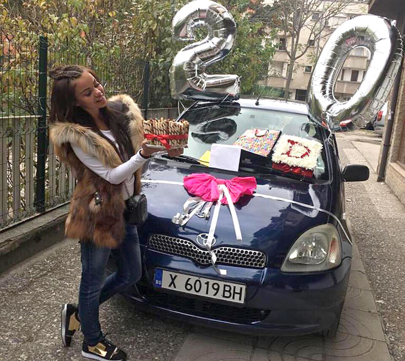 Второкурсничката в специалност „Право“ в Пловдивския университет „Паисий Хилендарски“ навършва 20 г. и за празника получи лек автомобил Тойота от майка си. Колата й с цялата украса и още куп подаръци бе докарана до Пловдив, където ще е партито от приятелките на рожденичката Анелия и Виктория.