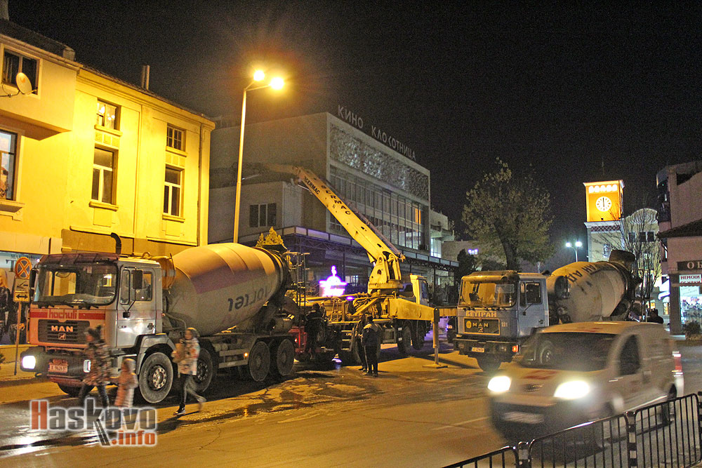 Три бетоновоза и тежка техника блокираха паркинга пред хасковското кметство по тъмно.