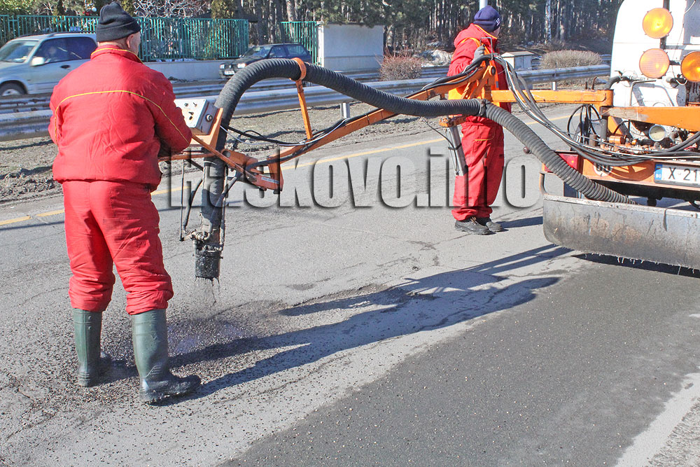 Машината впръсква битумна смес, която след това се валира и изсъхва сравнително бързо – за около час, обясниха от фирмата. Полиция придружава ремонтните дейности, за да се избегнат пътни инциденти.