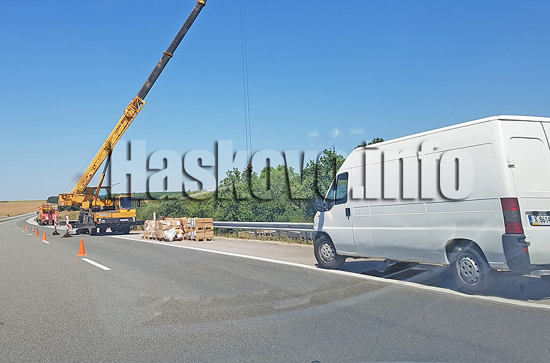 Преди да бъде изваден от дерето обаче тирът трябва да бъде разтоварен от стоката. За целта днес до него бе докаран кран. Докато се извършва разтоварването, едната лента на магистралата в посока Хасково е ограничена за движение.