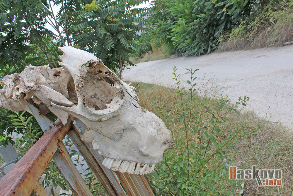 Животински череп е сложен на гробищната ограда, сякаш предупреждаващ за опасно разбития път към вилна зона „Куба“ в Хасково.