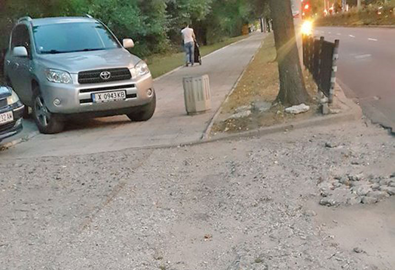 На снимката се вижда джип, паркирал на тротоара на булевард „Раковски“ в областния град. В същото време на тротоара е и бетонно кошче за боклук.