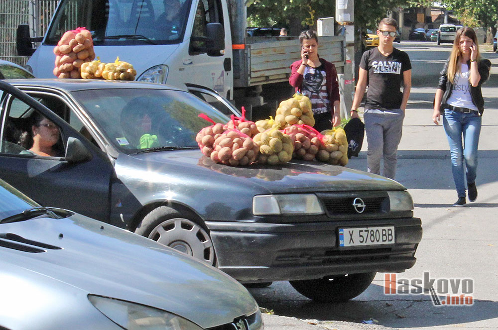 Търговци на картофи предлагат продукцията си, изложена върху кола на булевард "България" в Хасково.