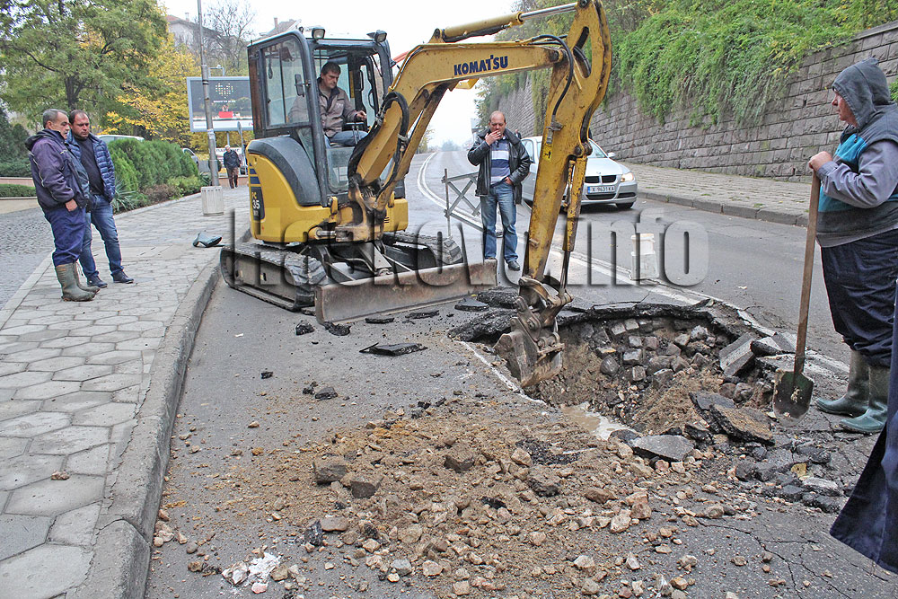 От ВиК разкопават булевард „Освобождение“ пред хотела, където сутринта пропадна асфалта. Там има поредна авария и водата е подкопала пътната настилка.