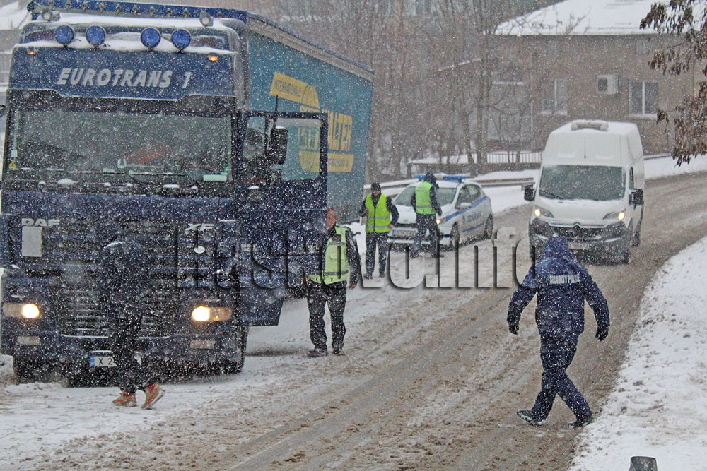Ремаркето на камиона се е завъртяло и се е ударило в мантинелата. Камионът е зареждал със стока „Авеню“ и празен е поел на път. Сега на гумите на тира се поставят вериги, за да може да потегли.