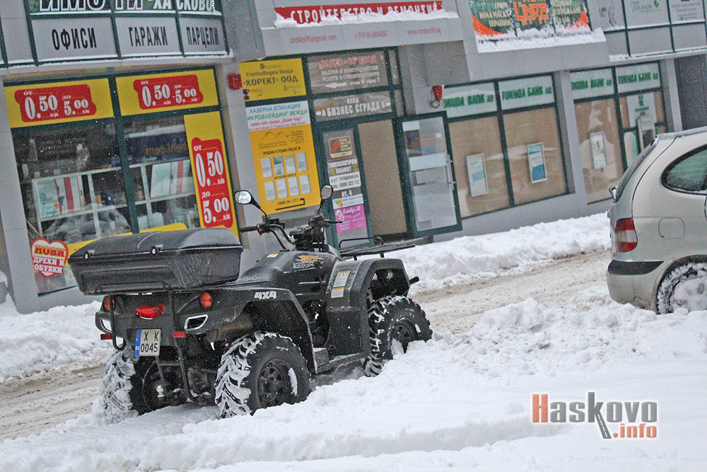 Тази сутрин хасковлия се придвижваше в снега до центъра на областния град с АТВ.